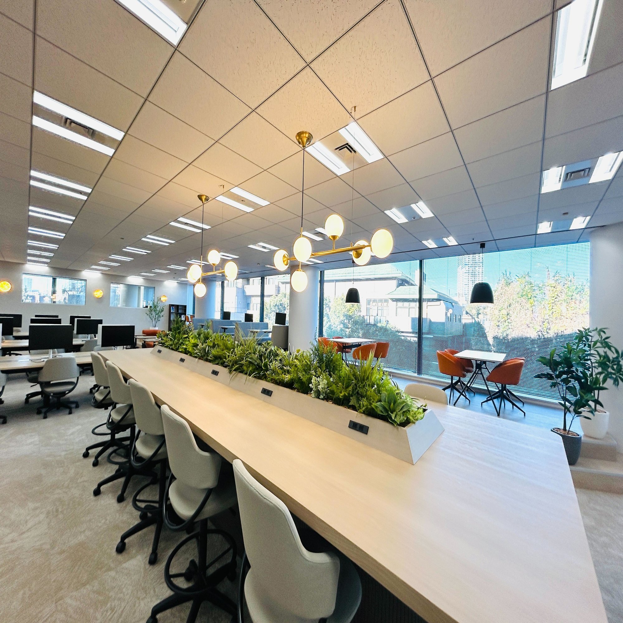 また、オフィス全体に配置されたグリーン(観葉植物)や、効果的に使ったデザイン性の高い部分照明が、メリハリとリラックスの共存を可能にしています。