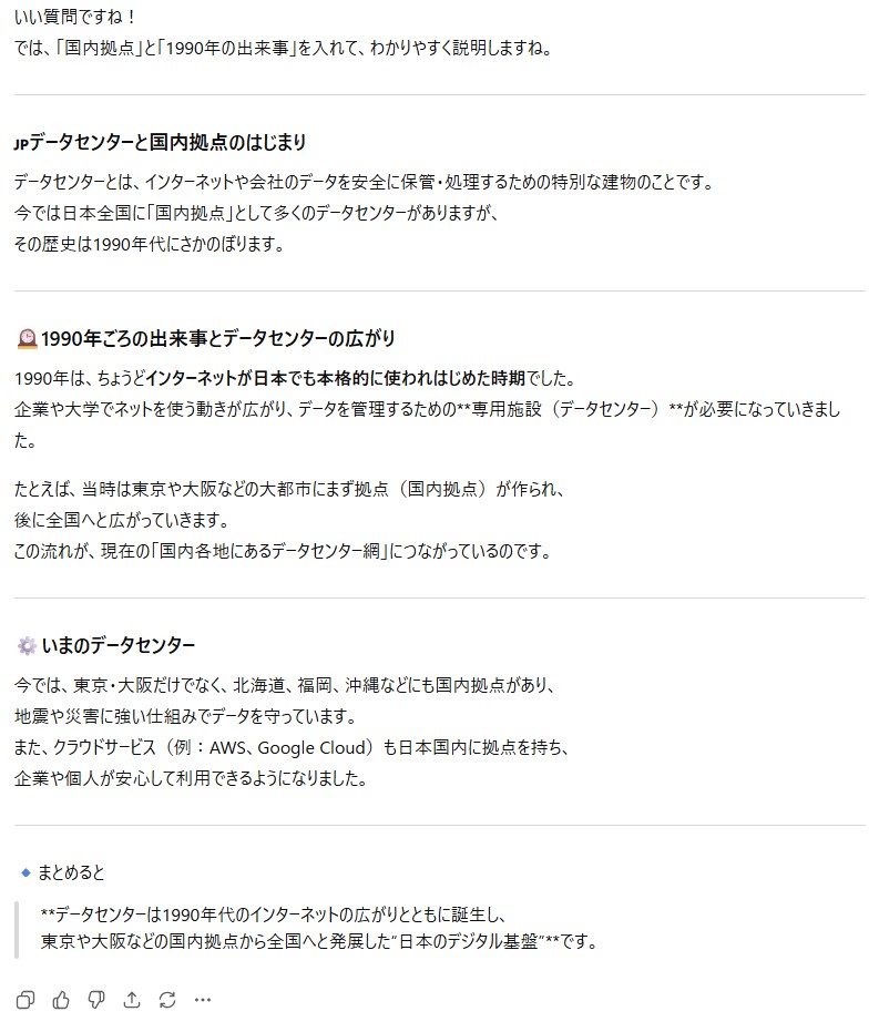 プロンプト:「データセンターについて、国内拠点というキーワードを使って、1990年の出来事を含めて説明してください。」