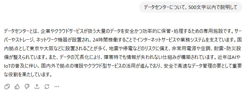 このように、指示によって回答が全然違います。「データセンター」について知りたいと思っていても、より具体的に指示を与えることで、自分が欲しい答えが返ってくる可能性が高まります。