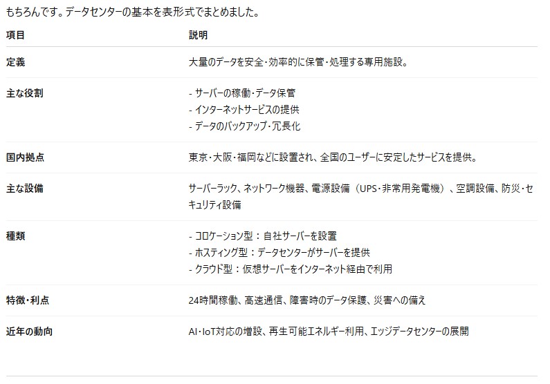 プロンプト:「データセンターについて、表形式で分かりやすく説明してください。」