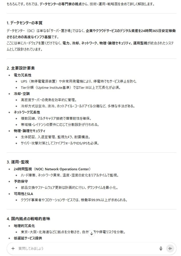 プロンプト:「あなたは、データセンターの専門家です。データセンターについて、プロの目線で教えてください。」